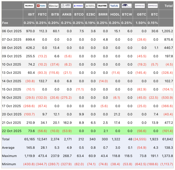 L'absence d'accumulation significative de la part des acteurs institutionnels rend la défense du niveau de 107 000 à 108 000 dollars de plus en plus difficile. Du 13 au 17 octobre, les ETF Bitcoin au comptant ont enregistré une sortie nette d'environ 1,23 milliard de dollars, selon les données de Farside. Ces chiffres soulignent l'absence actuelle d'achats institutionnels significatifs en période de baisse.