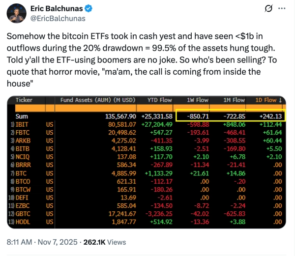 Selon Eric Balchunas, analyste principal des ETF chez Bloomberg, les sorties de capitaux des fonds négociés en bourse (ETF) vers le Bitcoin suite au krach historique du marché des cryptomonnaies en octobre, qui a entraîné une chute de 20 % du prix du BTC, ont été inférieures à 1 milliard de dollars.