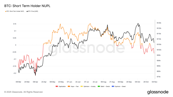 Selon Glassnode, l'indicateur Short-Term Holders' Net Unrealized Profit/Loss (NUPL) (STH) est revenu dans la zone de « capitulation ».