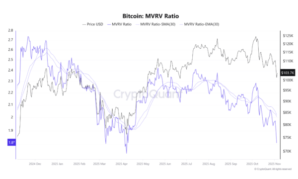 « L'indicateur oscille actuellement autour de 1,8. Il s'agit du niveau le plus bas depuis avril 2025 et d'un possible signe de stabilisation. Cela signifie que le prix du marché se rapproche du prix d'achat moyen des investisseurs, formant ainsi une zone d'accumulation », a écrit l'analyste.