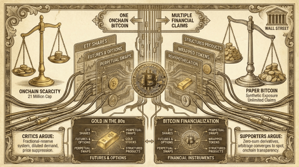 Plusieurs comptes X ont relancé un débat de longue date au sein de la communauté Bitcoin, arguant qu'un seul Bitcoin sur la blockchain supporte désormais de multiples obligations financières via des fonds négociés en bourse (ETF), des contrats à terme, des swaps perpétuels, des tokens enveloppés et des produits structurés. Cet argument, souvent qualifié de théorie du « Bitcoin papier », est directement comparé à la financiarisation de l'or dans les années 1980, lorsque les produits dérivés ont commencé à dominer la formation des prix.