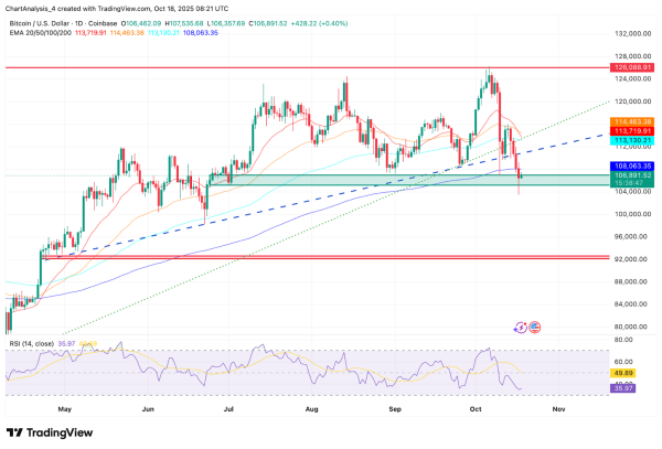Le Bitcoin consolide aujourd'hui près de 106 900 $, les acheteurs tentant de maintenir le support entre 105 000 $ et 104 000 $ après une semaine volatile. Ce mouvement est survenu après que le BTC a brièvement franchi la moyenne mobile exponentielle (MME) à 200 jours, suscitant des spéculations quant à la fin ou au début de la correction.