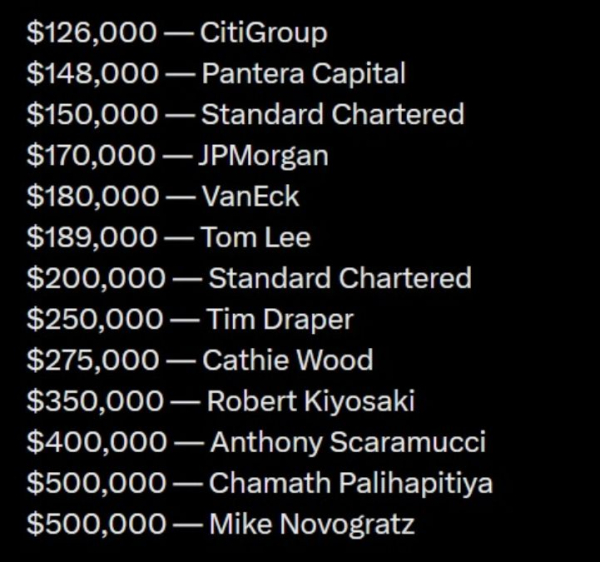 • Les employés du conglomérat financier Citigroup ont formulé la prédiction la plus prudente, selon laquelle le prix du $BTC atteindra 126 000 $ d'ici la fin de 2026 ;