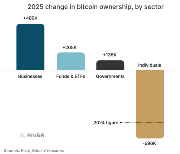 Selon River, la quantité de Bitcoin détenue par les particuliers a atteint un pic en 2024, et en 2025, un mouvement de retrait s'est amorcé, les particuliers réduisant leurs avoirs de 696 000 $ BTC . Sur la même période, les entreprises ont augmenté leurs avoirs de 489 000 $ BTC , les fonds et ETF de 205 000 $ BTC et les gouvernements de 135 000 $ BTC . Globalement, cette tendance stable indique que le Bitcoin devient un actif financier de plus en plus populaire.