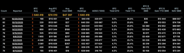 Le portefeuille Bitcoin total de Strategy s'élève désormais à 640 418 BTC, achetés pour 47,4 milliards de dollars à un prix moyen de 74 010 dollars.