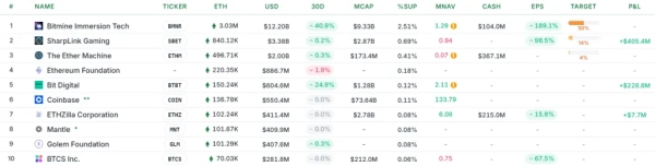 Les 10 plus gros détenteurs d'Ethereum parmi les entreprises cotées. Source : Strategic ETH Reserve.