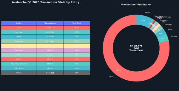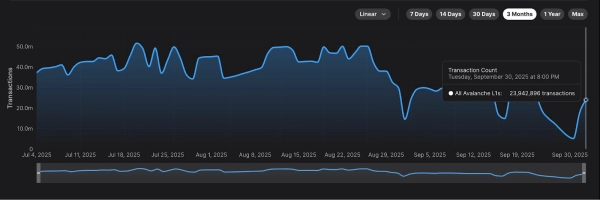 Les données de la blockchain Avalanche indiquent une activité utilisateur importante, avec une moyenne de plus d'un million de transactions par jour et un pic de 51 600 000 transactions par jour au cours du dernier trimestre, selon Nansen.