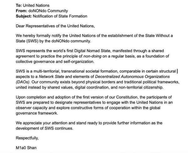 Les fondateurs de doNONdo ont adressé une notification officielle à l'ONU concernant la création d'une nouvelle structure gouvernementale et leur volonté de déléguer des représentants à l'assemblée permanente de l'organisation.