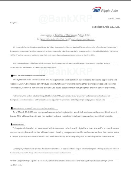 Le 26 mars 2026, SBI Ripple Asia a également obtenu son agrément officiel en tant qu'émetteur d'instruments de paiement prépayés. Cette étape lui permet d'émettre directement des instruments tokenisés via son système basé sur XRPL.