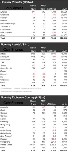 « Les produits d'investissement en cryptomonnaies ont enregistré des entrées de capitaux de 1,1 milliard de dollars. Il s'agit de la plus forte entrée de capitaux depuis janvier, alimentée par une inflation plus faible que prévu et une stabilité géopolitique améliorée. »