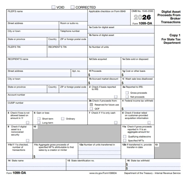 La déclaration fiscale des revenus d'actifs numériques provenant de transactions de courtage (1099-DA) sera applicable à partir de l'année civile 2026.