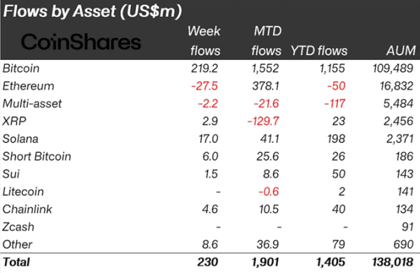 Les clients ont continué à se concentrer sur les fonds basés sur le Bitcoin (BTC), qui ont enregistré des entrées de 219,2 millions de dollars, contre 793,4 millions de dollars la semaine précédente.