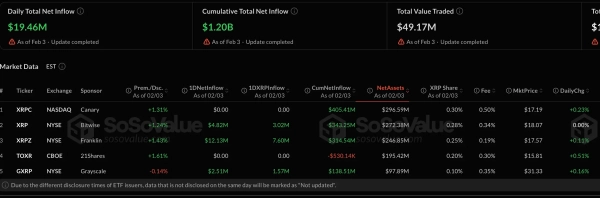 Contrairement aux ETF Bitcoin, les ETF Ether au comptant ont enregistré des entrées nettes d'environ 14 millions de dollars le 3 février. Parallèlement, les produits axés sur le XRP ont attiré près de 20 millions de dollars. Cela suggère que certains investisseurs réallouent leurs avoirs au sein du marché des cryptomonnaies plutôt que de s'en retirer.