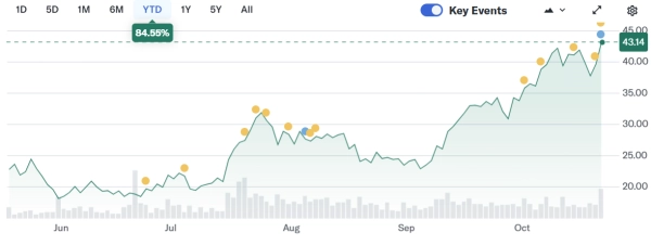 L'action Galaxy Digital a bondi suite à l'annonce des résultats, gagnant près de 16 % à un moment donné avant de s'échanger à la hausse en milieu de journée. Le titre a récemment dépassé les 43 $, en hausse d'environ 9 % en une journée.