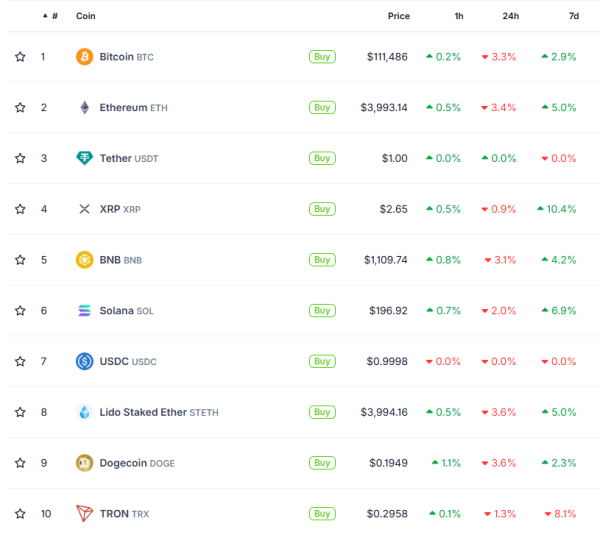 Le marché des cryptomonnaies reste insensible à la baisse de taux attendue. Source : CoinGecko