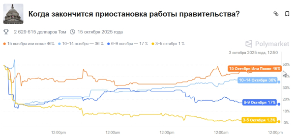 Dans le sondage « Quand la paralysie du gouvernement américain prendra-t-elle fin ? », qui a récolté 2,6 milliards de dollars, la probabilité que la paralysie prenne fin après le 15 octobre est de 46 %. La probabilité d'une date antérieure est plus faible.
