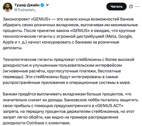 « Le GENIUS Act marque le début de la fin pour les banques qui peuvent escroquer leurs déposants particuliers en leur payant un intérêt minimal », a écrit samedi sur X le cofondateur et associé directeur de Multicoin Capital.
