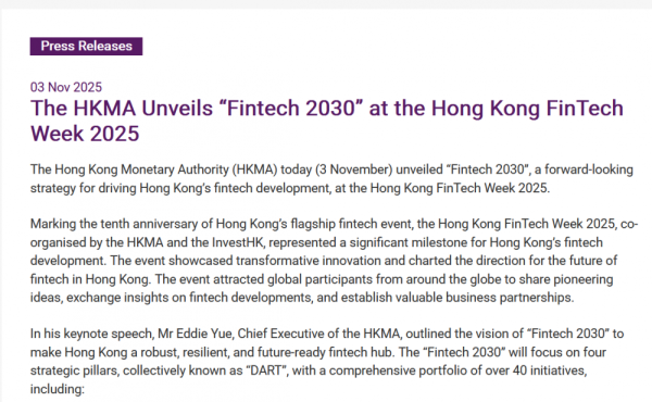 Dans un communiqué publié mercredi lors de la Hong Kong Fintech Week, la HKMA a déclaré que sa stratégie Fintech 2030 se concentrerait sur « quatre piliers stratégiques », appelés « DART », couvrant les données, l'intelligence artificielle, la durabilité et la tokenisation à travers 40 initiatives.