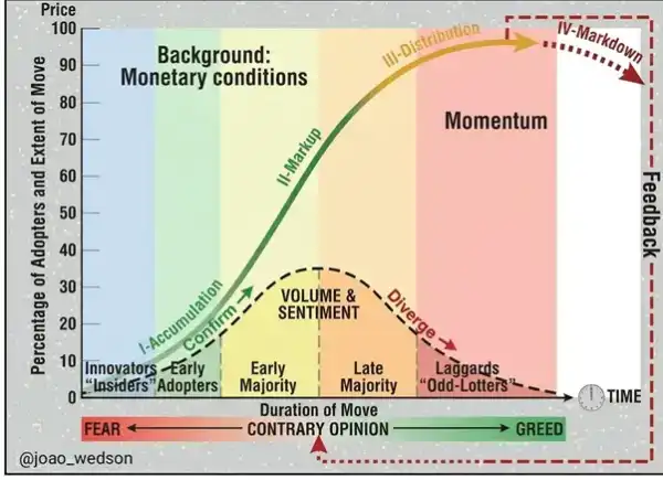 Vedson a souligné que, sur le marché des cryptomonnaies, il est important d'éviter de suivre aveuglément les tendances. Il recommande plutôt d'analyser les cycles de marché, de surveiller les fluctuations de liquidité et de prendre en compte le comportement des participants.
