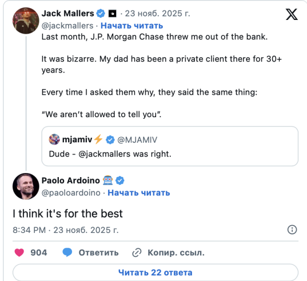 Jack Mallers, PDG de Strike et cofondateur de Twenty One Capital, a annoncé que JPMorgan Chase avait unilatéralement clôturé ses comptes personnels. Selon l'entrepreneur, les représentants de la banque ont refusé de fournir la moindre explication.
