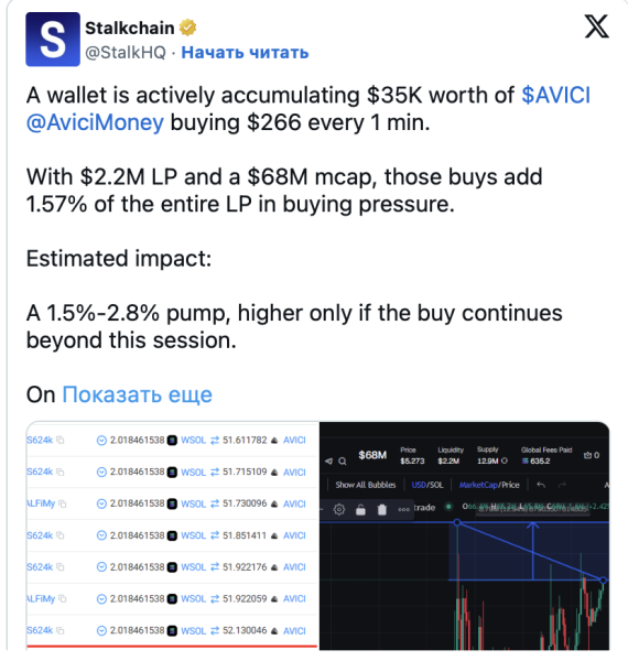 Stalkchain a signalé une forte augmentation des achats d'AVICI ces derniers jours. Un portefeuille a accumulé activement des jetons d'une valeur d'environ 35 000 $ à un rythme de 266 $ par minute.