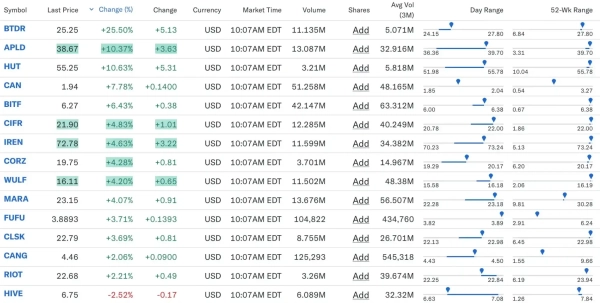 Cette dynamique positive s'est propagée à la quasi-totalité du secteur. Applied Digital et Hut 8 ont également enregistré une croissance à deux chiffres mercredi, tandis que presque toutes les autres entreprises ont approché leurs sommets annuels ou en ont établi de nouveaux.