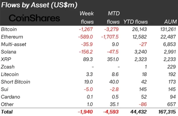 Les investisseurs ont retiré 589 millions de dollars des fonds Ethereum. Parmi les autres altcoins, Solana a enregistré la plus mauvaise performance, avec une sortie de capitaux de 156 millions de dollars. Seule exception : XRP, avec 89,3 millions de dollars investis dans des instruments liés à cette cryptomonnaie.