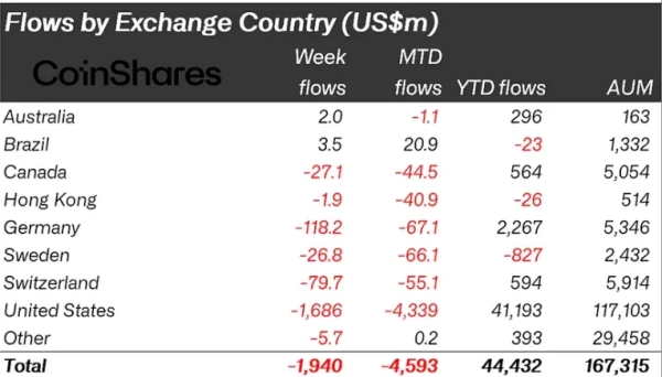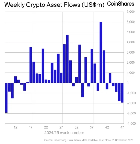 Du 15 au 21 novembre, les sorties de capitaux des produits d'investissement en cryptomonnaies ont totalisé 1,94 milliard de dollars. Cette tendance négative se poursuit pour la quatrième semaine consécutive, selon un rapport de CoinShares.