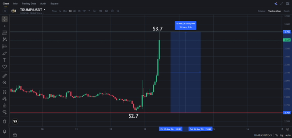 La cryptomonnaie TRUMP, lancée par le président américain Donald Trump, a bondi de 18 % en 24 heures pour atteindre 3,70 $ après l'annonce d'un événement exclusif pour ses plus importants détenteurs. Les gagnants auront le privilège de dîner avec le président à Mar-a-Lago, sa résidence en Floride.