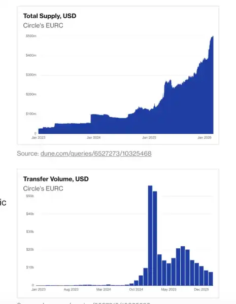 Les stablecoins en euros, notamment l'EURC de Circle, dominent le marché. Ils représentent plus de 80 % de la capitalisation boursière et environ 85 % du volume des transactions. Fin 2025, l'offre de jetons dépassait 500 millions de dollars. Un stablecoin indexé sur le real brésilien (BRL) représente environ 10 % du marché. L'intérêt pour les actifs adossés au dollar singapourien et au yen japonais s'est également accru.