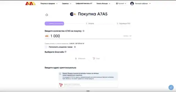 Une fois le paiement confirmé, les jetons A7A5 sont émis et crédités directement à l'adresse du portefeuille spécifiée sur le réseau sélectionné.