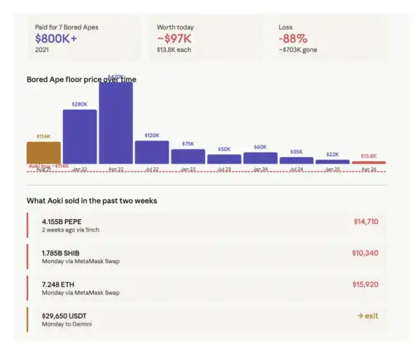 Le portefeuille d'Aoki a vendu 1,785 milliard de jetons SHIB pour environ 10 300 $, échangé 7,25 ETH contre 15 900 $ et transféré 29 650 $ en USDT sur Gemini. Deux semaines auparavant, ce même portefeuille avait vendu 4,155 milliards de memecoins PEPE via 1inch pour 14 700 $. Arkham a également enregistré de petits transferts de stablecoins, compris entre 600 $ et 1 700 $, via MetaMask.